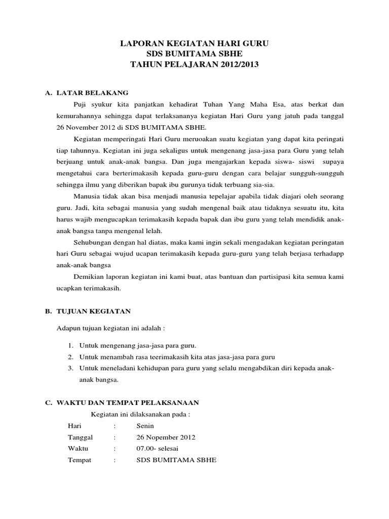 Klubgurusmi@yahoo.co.id latar belakang "guru adalah pendidik . Judul kegiatan atau nama kegiatan; Contoh contoh proposal kegiatan hari guru di sekolah pdf. Sejak dahulu, dunia tidak terlepas dari pendidikan. Tema kegiatan, latar belakang kegiatan, tujuan kegiatan, target kegiatan;